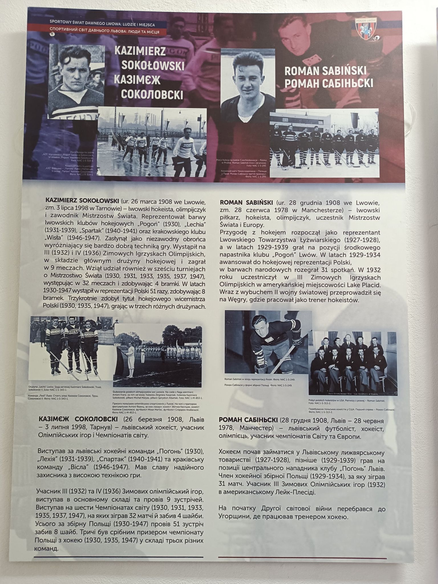 Spośród wielu znakomitych sportowców, którzy znaleźli się na kolejnych planszach wystawy wymienić można Kazimierza Górskiego, Michała Matyasa, Spirydiona Albańskiego. O każdym z nich można mówić bez końca. Kazimierz Górski to przecież legendarny trener piłkarskiej reprezentacji Polski, twórca największych jej osiągnięć: złotego medalu na olimpiadzie w 1972 roku w Monachium, trzeciego miejsca na mistrzostwach świata w RFN w 1974 roku, srebrnego medalu na olimpiadzie w 1976 roku w Montrealu. Michał Matyas trener drużyny piłkarskiej Górnika Zabrze, z którą w 1970 roku dotarł do finału Pucharu Zdobywców Pucharów. Z kolei Spirydion Albański to legendarny bramkarz Pogoni Lwów i reprezentacji Polski. Na olimpiadzie w Berlinie w 1936 roku zagrał w naszej narodowej drużynie wszystkie mecze (4), a zajęła ona czwarte miejsce. Warto wspomnieć, że Spirydion Albański wraz ze swoją żoną Eustachią pochowany jest w Katowicach na cmentarzu przy ul. Francuskiej.